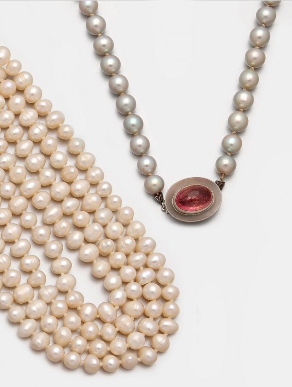 Two necklaces set with grey and white culture pearls, clasp in 14 k white gold, set with pink tourmaline.