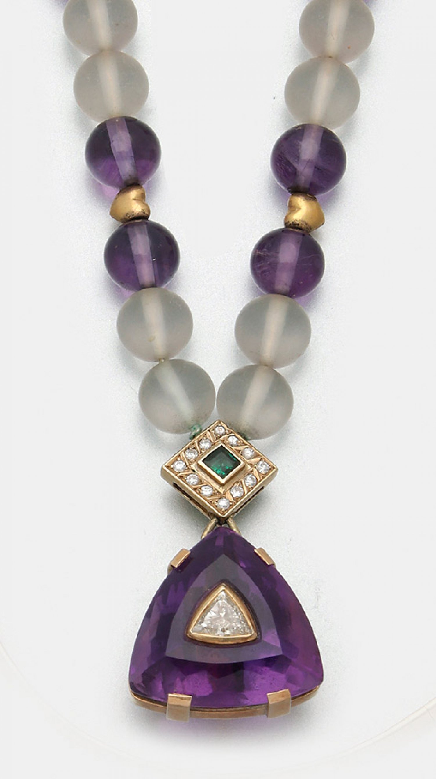 Dekoratives Amethyst-Collier mit Diamant-Solitär Gelbgold, gest. 585. Einreihige Kette aus weißen Topas-Perlen sowie fliederfarbenen Amethyst-Perlen, abschließender triangelförmiger Anhänger besetzt mit einem korrespondierend geschliffenen Amethyst sowie einem Diamanten von ca. 0,25 ct.; Gew. ca. 47,65 g.
