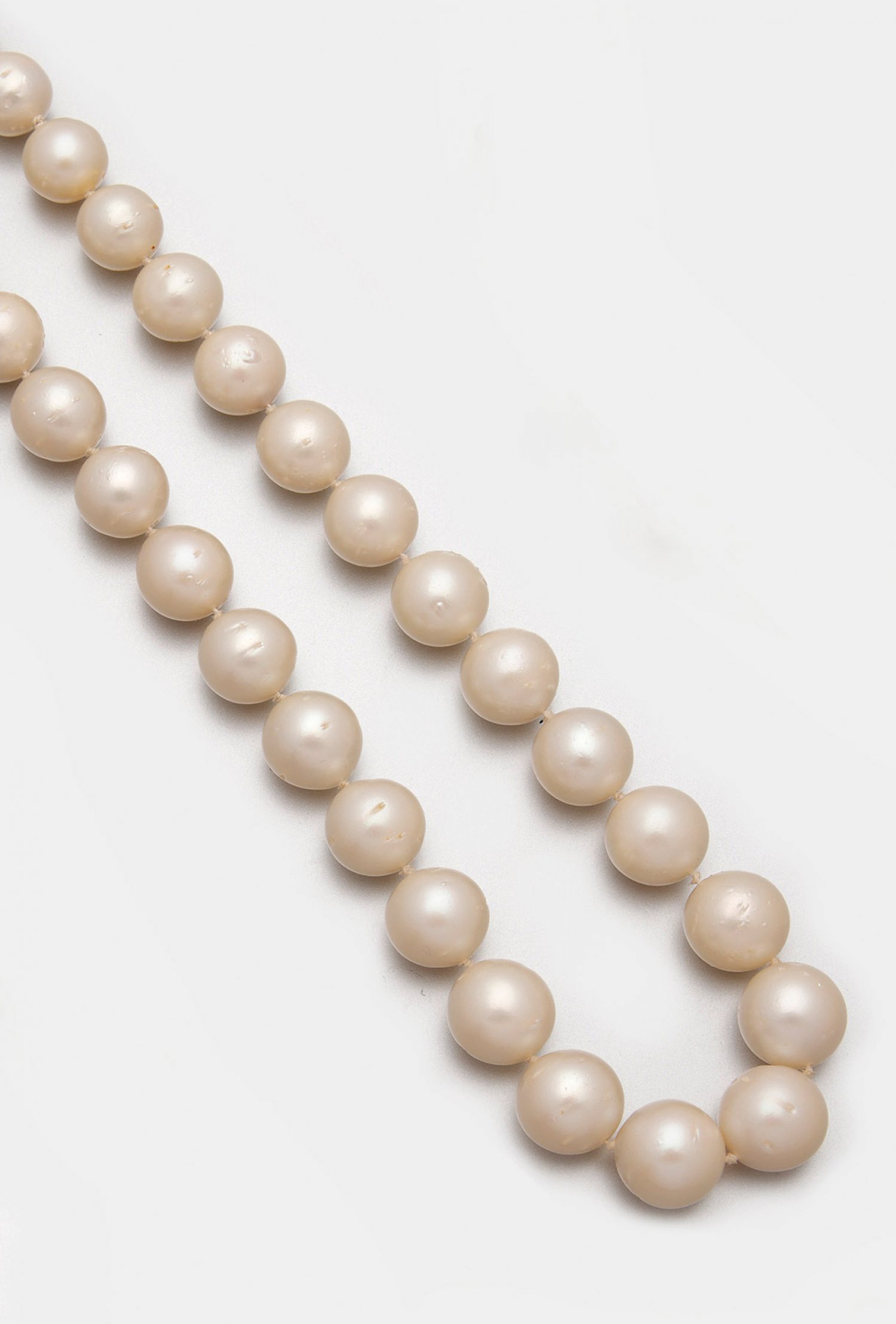 Großes Südsee-Perlcollier 14 ct., Gelbgold. Einreihige, leicht verlaufende Kette aus 33 weißen Südsee-Zuchtperlen von ca. 11,1 mm - 14 mm in sehr feinem rosé-grün changierendem Lüster. Kugelschließe mit Diamantbesatz.