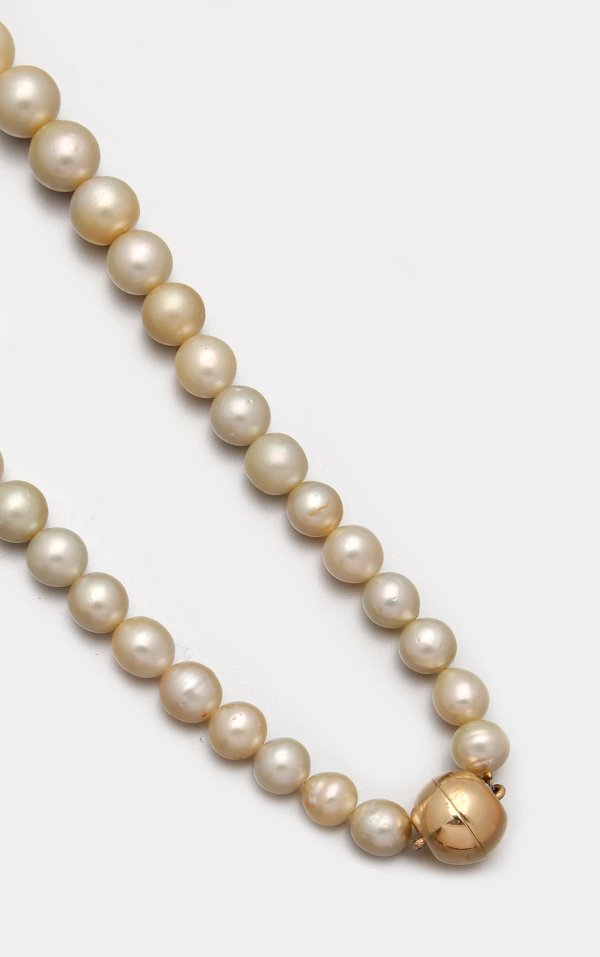 Elegantes Südsee-Perlcollier Gelbgold, gest. 585. Einreihige, leicht verlaufende Kette aus insges. 35 goldgelben Südsee-Zuchtperlen von ca. 9,7 mm -14 mm in sehr feinem rosé-grün changierendem Lüster. Kugel-Magnetschließe.