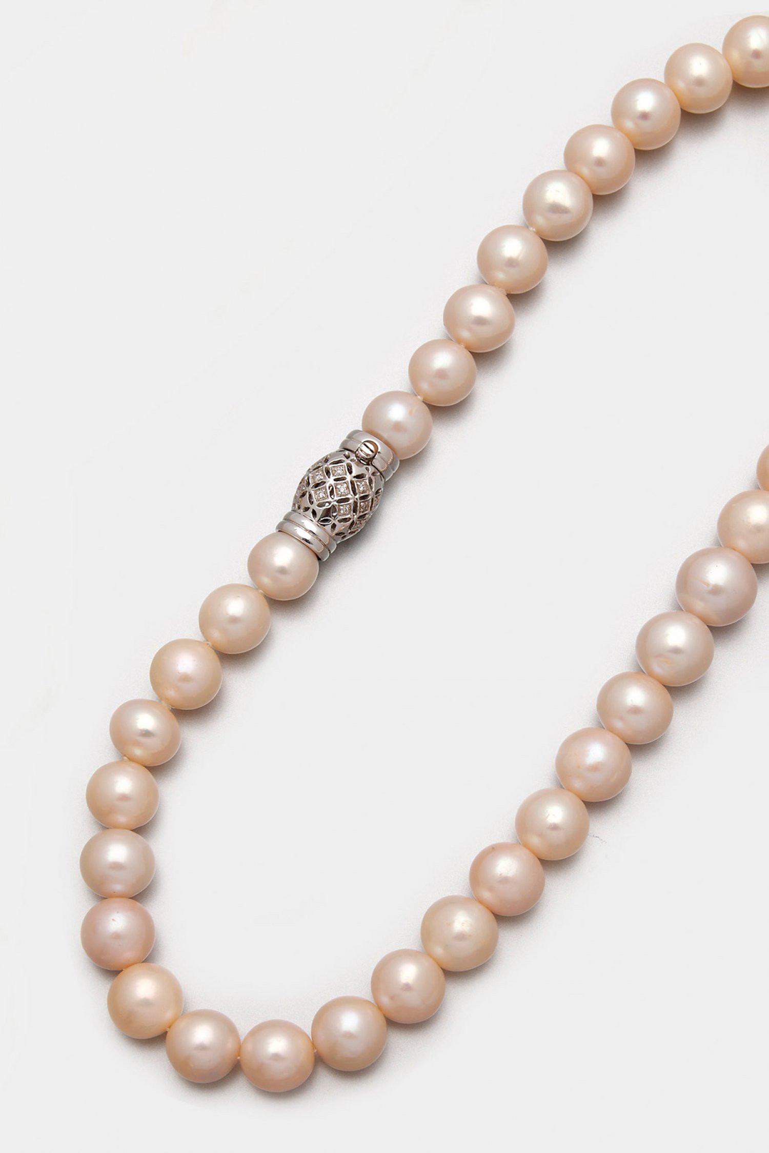 Elegantes Südsee-Perlcollier Weißgold, gest. 750. Einreihige Kette aus cremefarbenen Südsee-Perlen von 10,5 mm - 12,5 mm, in sehr farbintensivem rosé-grün changierendem Lüster. Schließe in Ajour mit kleinen Diamanten besetzt.
