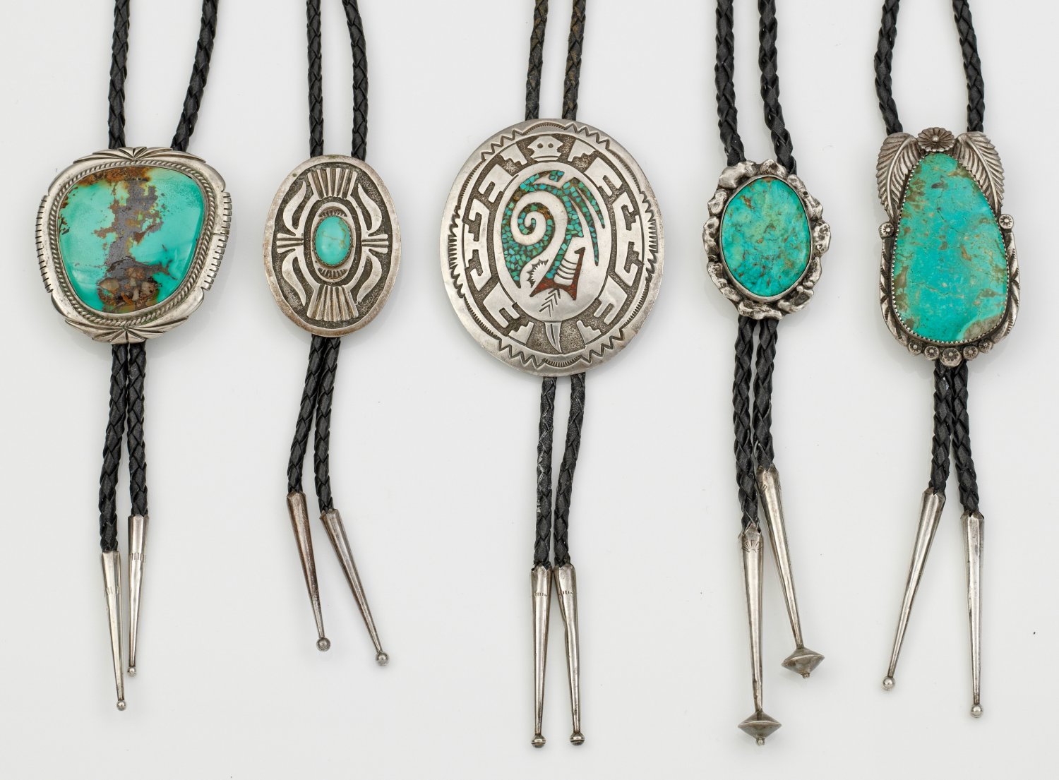 Konvolut von fünf Bolo Ties Silber, Türkis und Koralle. Ovale bzw. medaillonähnliche Form. Schauseitig u.a. besetzt mit großen Türkisen. Teilw. mit reliefplastisch gearbeiteter Fassung in Form von Blüten, Blättern und Ranken bzw. graviert mit abstrakter Ornamentik. Geflochtene Lederbänder mit ziselierten, konisch zulaufenden Zierspitzen. Teilw. gest. Sterling, Herstellerzeichen.