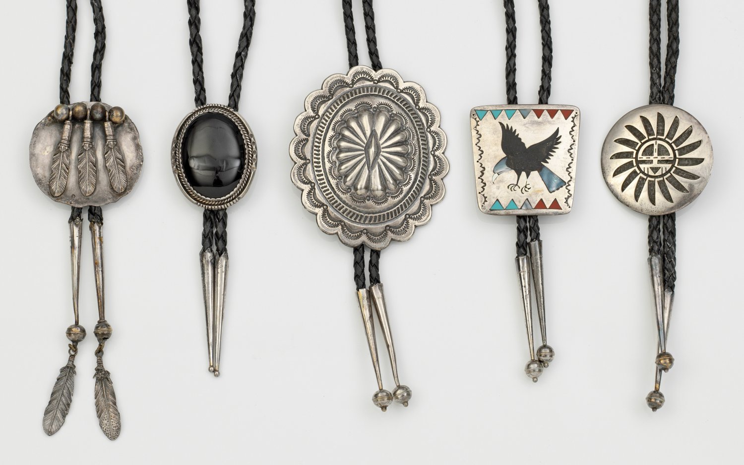 Kollektion von fünf Bolo Ties Silber. Ovale bzw. trapezähnliche Form. Türkis, Koralle sowie Perlmutter und schwarzer Schmuckstein. Schauseitig u.a. Darstellung eines Adlers bzw. plastisch gearbeiteter Federn. Geflochtene Lederbänder mit ziselierten, konisch zulaufenden Zierspitzen. Teilw. gest. Sterling.