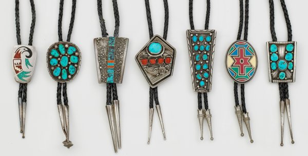 Konvolut von sieben abstrakt gestalteten Bolo Ties Teilw. Silber. Rechteckige oder ovale Form. Schauseitig besetzt mit eingefassten Türkisen sowie Koralle. Polychrome, geometrische und abstrakte Darstellungen bzw. reliefplastisch gearbeitete Ornamentik. Geflochtene Lederbänder mit ziselierten, konisch zulaufenden Zierspitzen. Teilw. gest. Sterling, Herstellerzeichen.
