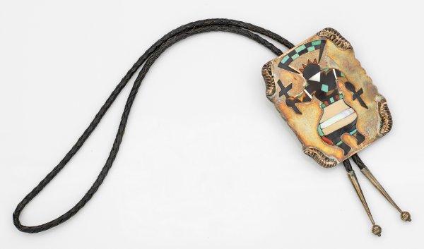 Zuni Bolo Tie Silber, Türkis, Perlmutter, Koralle sowie Schildpatt. Rechteckige Form. Darstellung eines tanzenden Mannes mit zwei Kreuzen in den Händen. Ecken mit reliefartigen Ornamenten. Geflochtene Lederbänder mit konisch zulaufenden Zierspitzen. Herstellerzeichen A.R.B.; Gew. ca. 150 g.