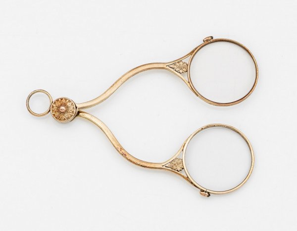 Scherenbrille Doublé. Zusammenklappbar. Durch eine Nietverbindung beweglich. Miteinander verbundene geschwungene, dünne Bügel. Ringförmiger Abschluss. Mit schlichtem, filigranen Blattdekor. Undeutl. gest.; L. 11,5 cm.