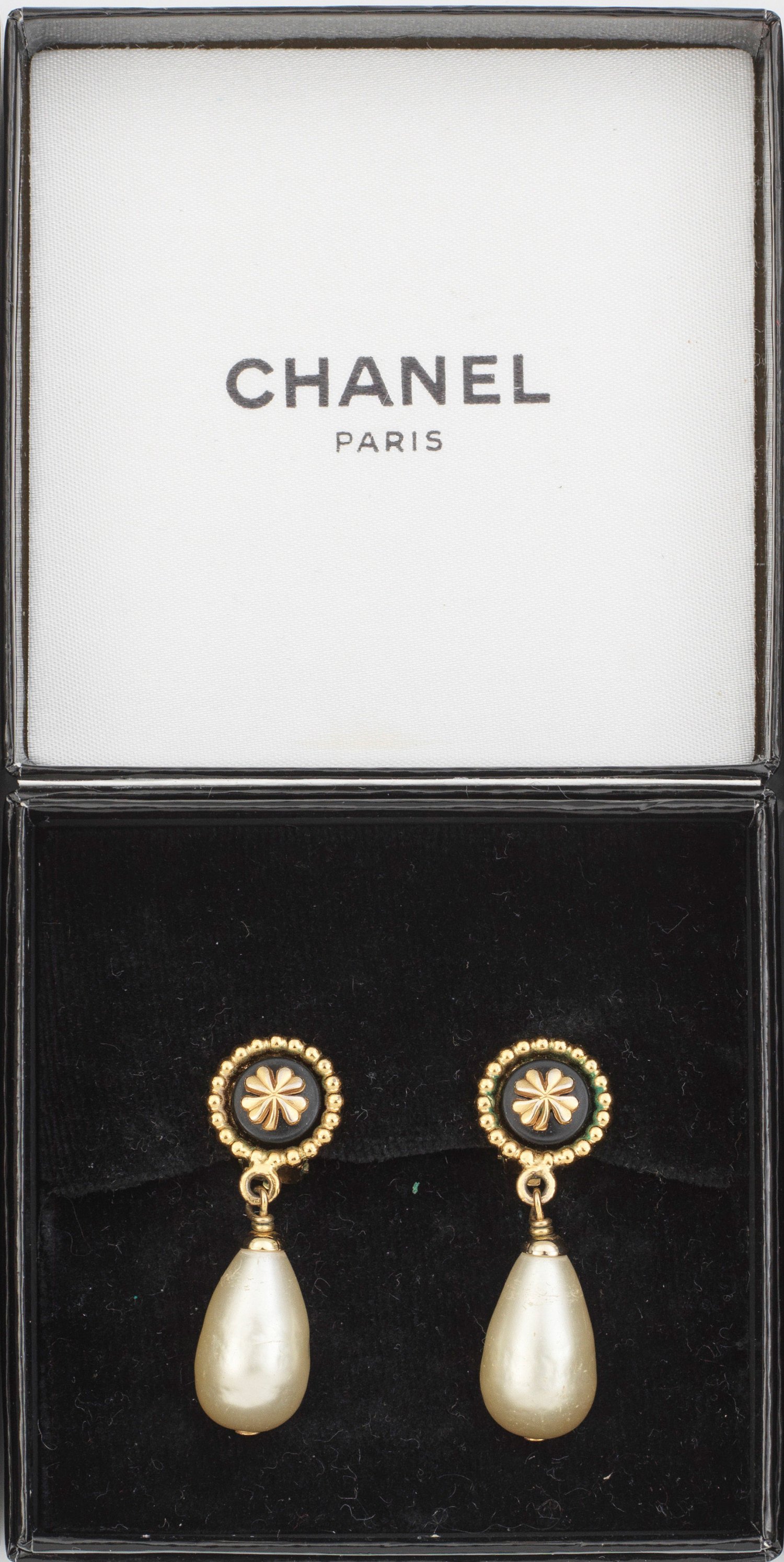 Paar Vintage-Ohrclips von Chanel Metall, vergoldet und Glas. Von Perlstab gerahmtes Tondo mit Rosettenmotiv. Unterhalb großer Tropfen. Herstellerzeichen 95 und A sowie Made in France. L. 4 cm. Gebrauchsspuren. Original Karton.