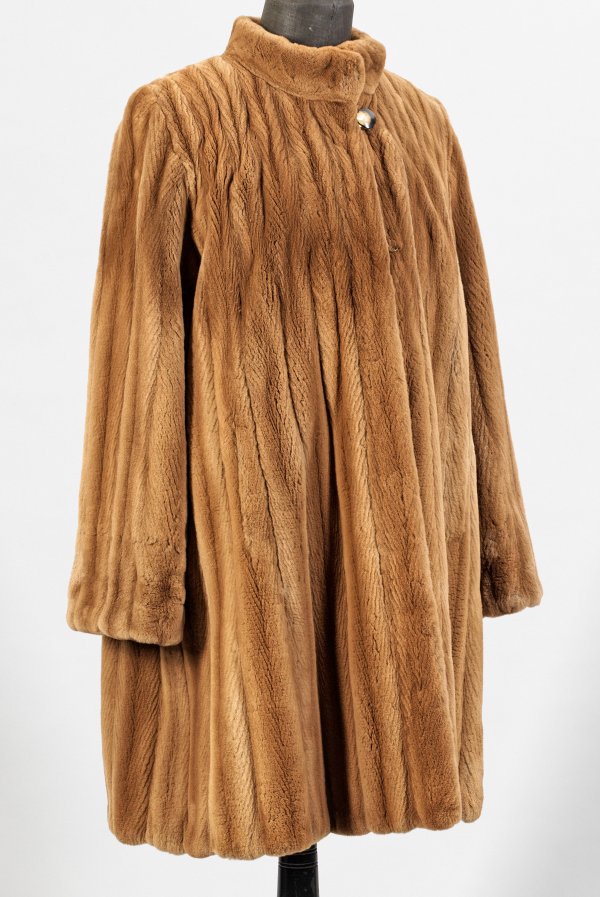 Nerzmantel von Bischoff Knielanger, ausgestellt geschnittener Mantel aus hellbraunem, ausgelassen verarbeitetem und geschorenem Nerz mit niedrigem Stehkragen sowie seitlichen Eingrifftaschen. Helles Innenfutter. Herstellerzeichen Bischoff Hannover. Wenig getragen. Gr. ca. 40/42. Mantel-L. 100 cm.