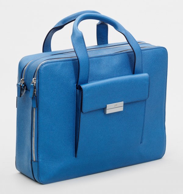 Porsche Design-Aktentasche "French Classic" Hellblaues Leder. Rechteckiger Korpus mit zwei Reißverschlüssen für zwei Hauptfächer sowie zwei Handhaben. Innen diverse Nebenfächer, teilw. mit Reißverschluss. In der Front kleines Fach mit silberfarbenem Verschluss sowie rückseitig flaches Nebenfach. Abnehmbarer Schulterriemen. Herstellerzeichen. Originaler Staubbeutel. Neuwertig. H. 30 cm. 44 cm x 11 cm.