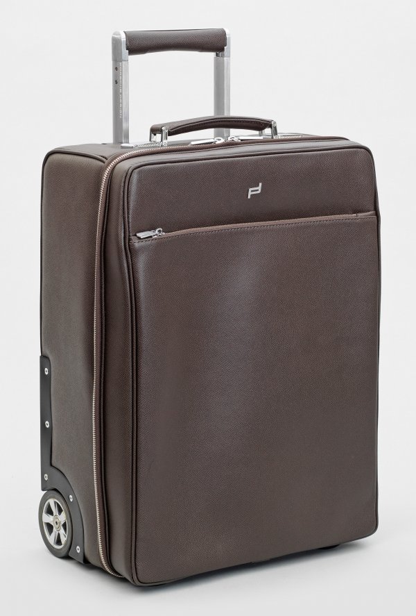 Porsche Design-Reisetrolley "French Classic 3.0" Schokoladenbraunes Leder. Rechteckiger Korpus auf zwei Rollen mit ausziehbarem Handzug. Außen wie innen Facheinteilung mit Reißverschluss. Herstellerzeichen. Original Staubbeutel. Neuwertig. H. 50 cm. 34 cm x 20 cm.
