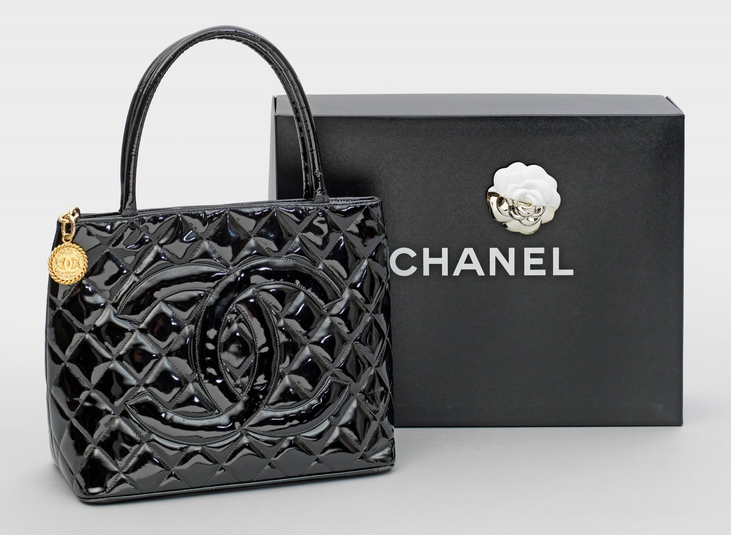 Vintage Chanel-Tasche aus den 1990er Jahren Schwarzes Lackleder in Rautensteppung. Rechteckige Form, schauseitig mit großem CC-Logo sowie innen Facheinteilung. Am Reißverschluss goldfarbene Gliederkette mit CC-Logo. Beriebener Date-Code 460(...). Herstellerzeichen sowie Made in France. Karton mit Kamelien-Applikation in Weiß und Silber. Staubbeutel. Gebrauchsspuren. H. 24,5 cm. 30 cm x 15 cm.