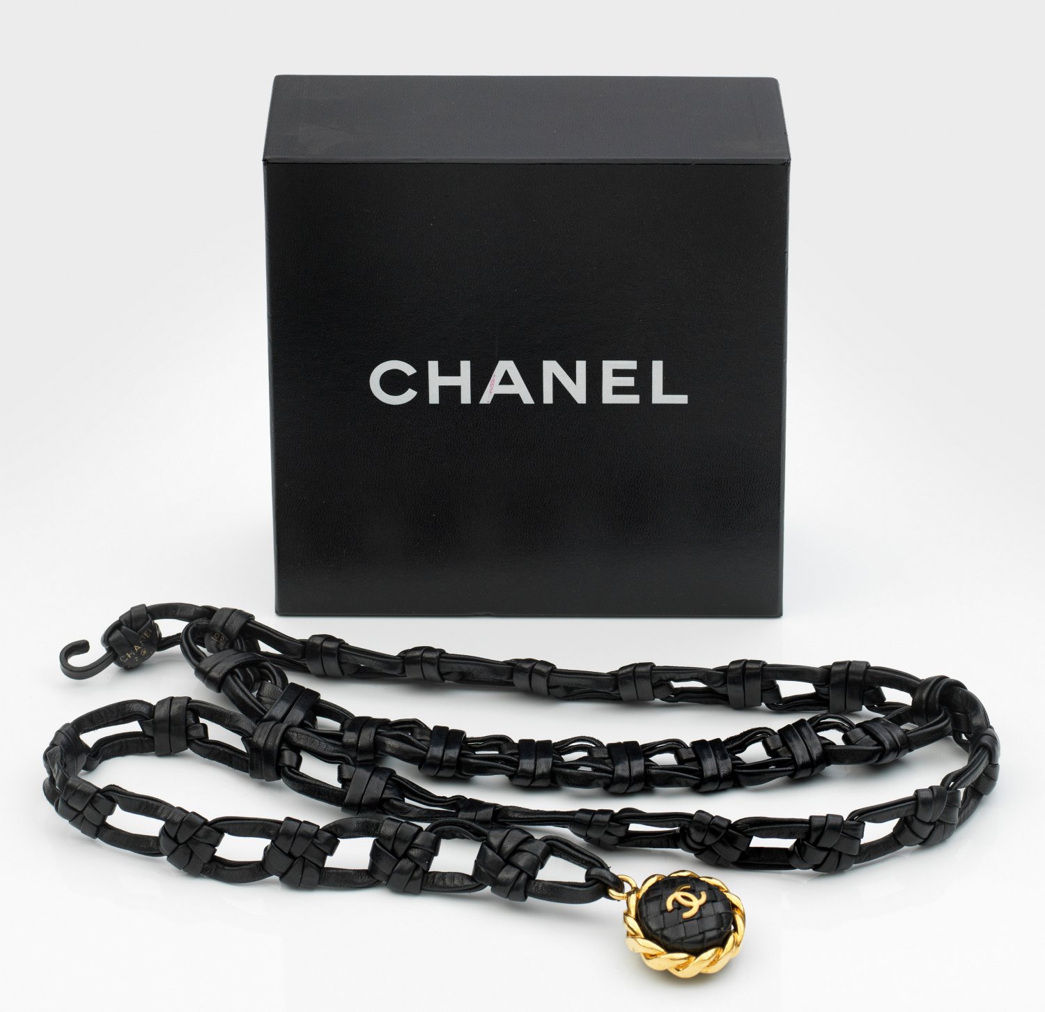 Vintage-Gürtel von Chanel Schwarzes Kalbsleder. Geflochtener, teilw. zweireihig angeordneter Gürtel mit Hakenverschluss. Von Kettengliedern umrahmtes CC-Logo. Herstellerzeichen sowie Made in France. Größe 75/30. Ges.-L. 90 cm. Gebrauchsspuren. Original Box.