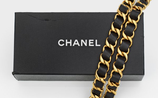 Vintage-Gürtel von Chanel Schwarzes Kalbsleder und vergoldete Hardware. Von einem breiten Lederband durchzogene Kettenglieder. Herstellerzeichen, 96 P sowie Made in France. Größe 85/34. Ges.-L. 90 cm. Gebrauchsspuren. Original Karton, unw. besch.
