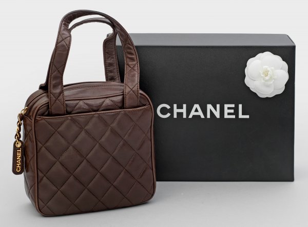 Kleine Vintage Chanel-Handtasche von 1996/1997 Maronenfarbenes Kalbsleder in Rautensteppung. Rechteckige Form mit seitlichen Einstecktaschen und zwei Henkeln, innen Facheinteilung. Bodenunterseite mit CC-Logo. Date-Code 4236541. Herstellerzeichen sowie Made in Italy. Original Karton mit weißer Chanel-Kamelie. Carte D'Authenticité und Staubbeutel. H. 18 cm. 19 cm x 7,5 cm.