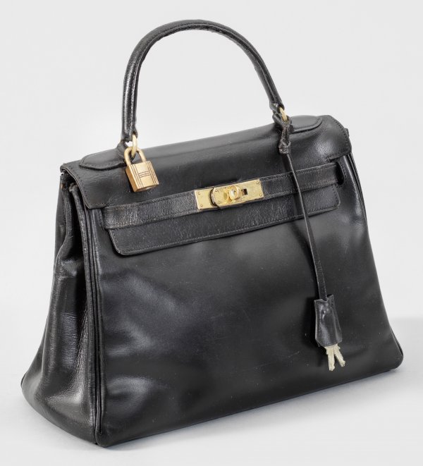 Vintage "Kelly Bag" von HERMÈS Schwarzes Boxleder mit vergoldeter Hardware. Großes und drei kleine, offene Innenfächer. Herstellerzeichen. Ohne Date-Code. Schloss- und Schlüssel Nr. 003. Starke Gebrauchsspuren, teilw. besch. bzw. rep.; Ohne Schulterriemen. Ges.-H. 30 cm. 30 cm x 12 cm.