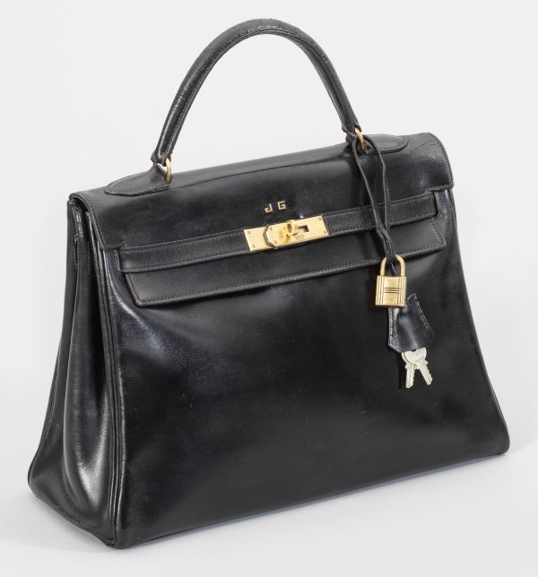 Vintage-Handtasche "Kelly Bag 32" von HERMÈS Schwarzes Boxleder mit vergoldeter Hardware. Großes und zwei kleine Innenfächer sowie Reißverschlussfach. Blindstempel Z. Herstellerzeichen. Schloss- und Schlüssel Nr. 005. Gebrauchsspuren. Ohne Schulterriemen. Eingelassenes Besitzermonogramm JG. Ges.-H. 33 cm. 32 cm x 12 cm.