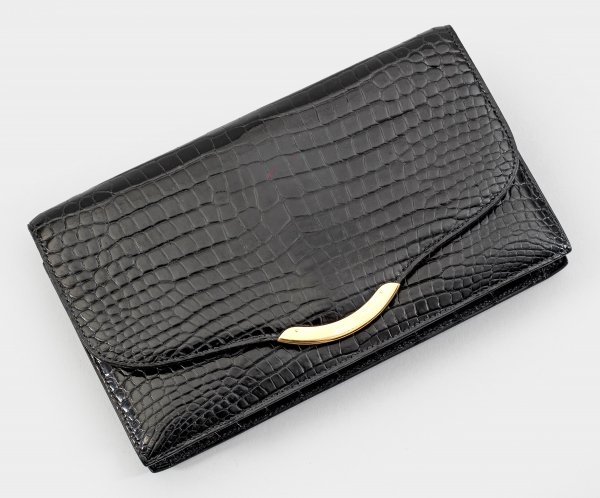 Luxuriöse Vintage HERMÈS-Clutch "Ondine" von 1962 Schwarzes, glanzgestoßenes Krokodilleder, schwarzes Kalbsleder sowie 18ct Gold-Hardware. Flacher, querrechteckig angelegter Korpus mit weit übergeschlagenem, gerundeten Verschluss. Innen großes Hauptfach sowie drei flache Nebenfächer teilw. mit Reißverschluss. Blind-Stamp 2 R. Herstellerzeichen und Made in France. Ohne Gliederkette. H. 12,5 cm. 22 cm x 3 cm.