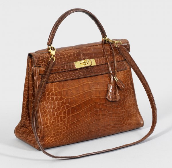 Hermès Handtasche "Kelly Bag 32" von 1992 Hellbraunes Mississippi-Alligatorenleder Maron mit vergoldeter Hardware. Zwei kleine Innenfächer sowie ein Reißverschlussfach. Blindstempel 21 R V im Kreis. Partiell retuschiert. Hersteller-Logo. Schloss und Schlüssel-Nr. 007. Sehr schöne Patina. H. 32 cm. 32 cm x 12 cm.