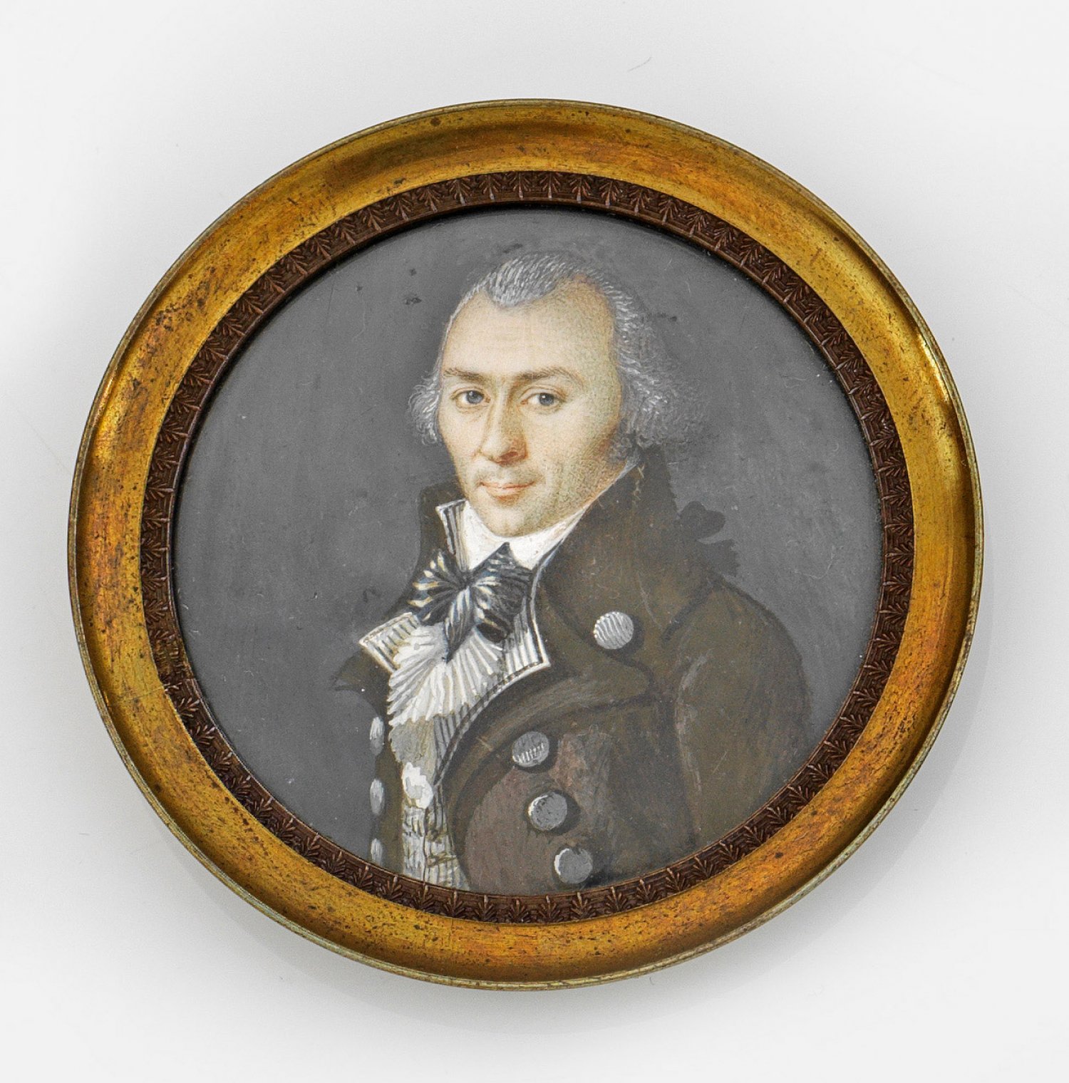 Herrenporträt Brustbildnis nach links, Gesicht nahezu frontal. Herr in dunkelbraunem Frack, weißem Hemd und Jabot. Das lange Haar zu einer schwarzen Schleife gebunden. Dunkelgrauer Hintergrund. Tempera auf Elfenbein. Messingrahmen. D. 4,8 cm.