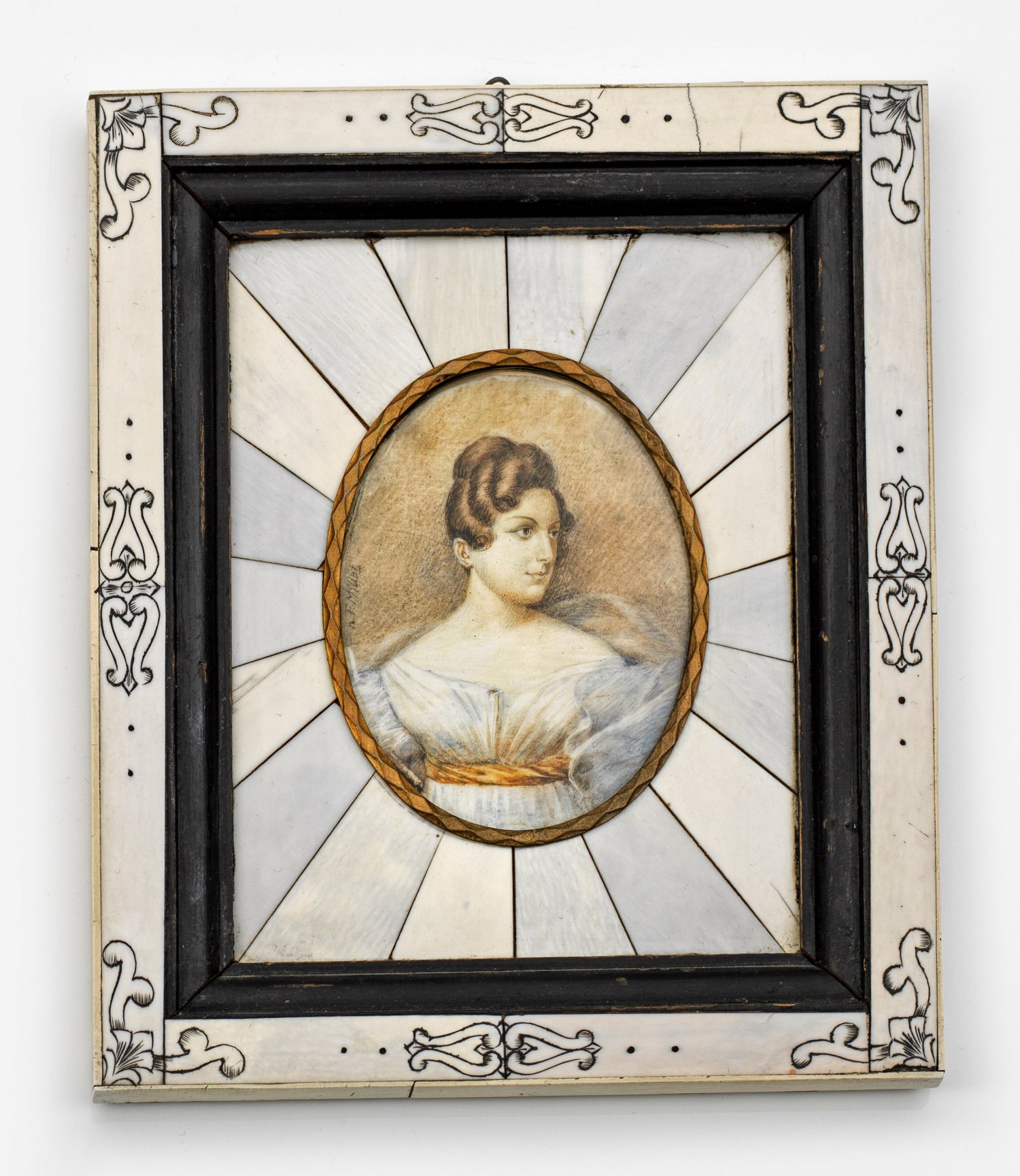Damenporträt Hüftbildnis einer jungen Dame in weißem, hauchfeinem Seidenkleid mit gelbem Taillenband. Dunkelbraune Haare in ordentlich gelegte Locken hochgesteckt. Tempera auf Elfenbein. L. m. bez. n. F. Millet. Breiter Rahmen mit teilw. schwarz graviertem Elfenbein belegt. Messingblende. 8,5 cm x 6,5 cm.