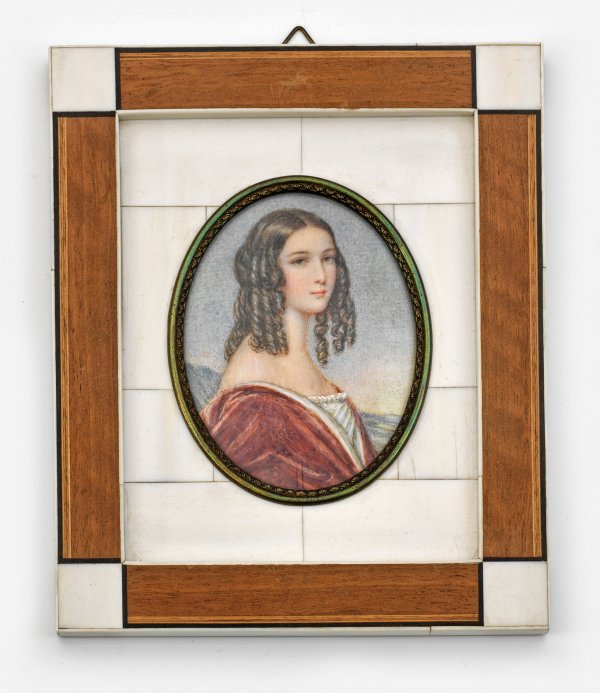 Damenporträt von Friederike v. Gumppenberg Bildnis der jungen Dame in rot-weißem Kleid vor Landschaftshintergrund. Rückseitig bez. n. Stieler aus der Münchner Schönheitsgalerie. Tempera auf Elfenbein. Teilw. ebonisierter, mit Elfenbein belegter Rahmen. Messingblende. 8,5 cm x 6,5 cm.