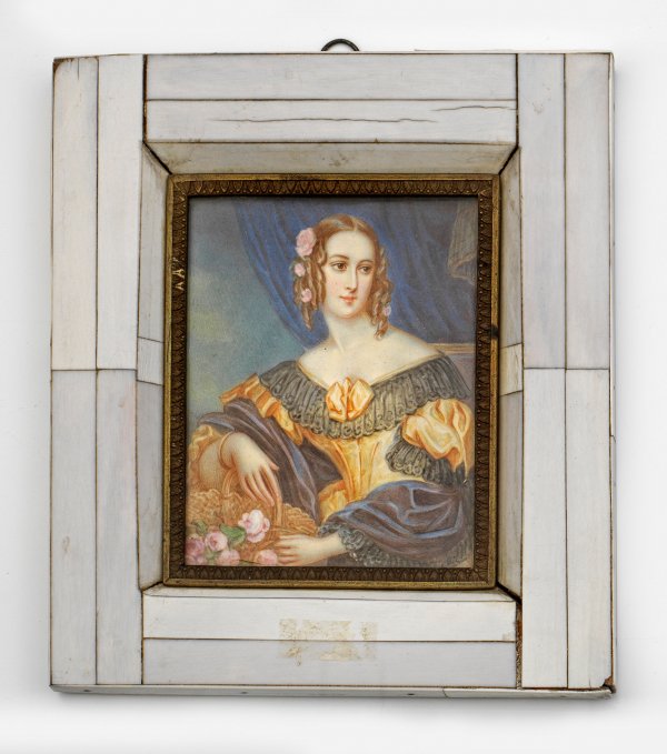 Damenporträt Hüftbildnis der sitzenden Miss Paynter, neben sich einen Rosenkorb. Bekleidet mit prächtigem Biedermeierkleid. Hochgesteckte Korkenzieherlocken geschmückt mit zarten Rosenblüten.Rückseitig bez.; Tempera auf Elfenbein. Breiter, mit Elfenbein belegter Rahmen. Messingblende. Verglasung minim. best.; 10 cm x 8 cm.