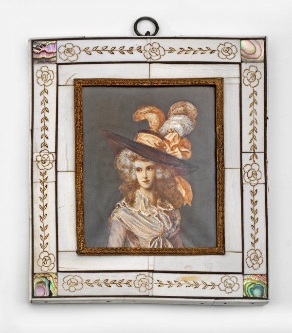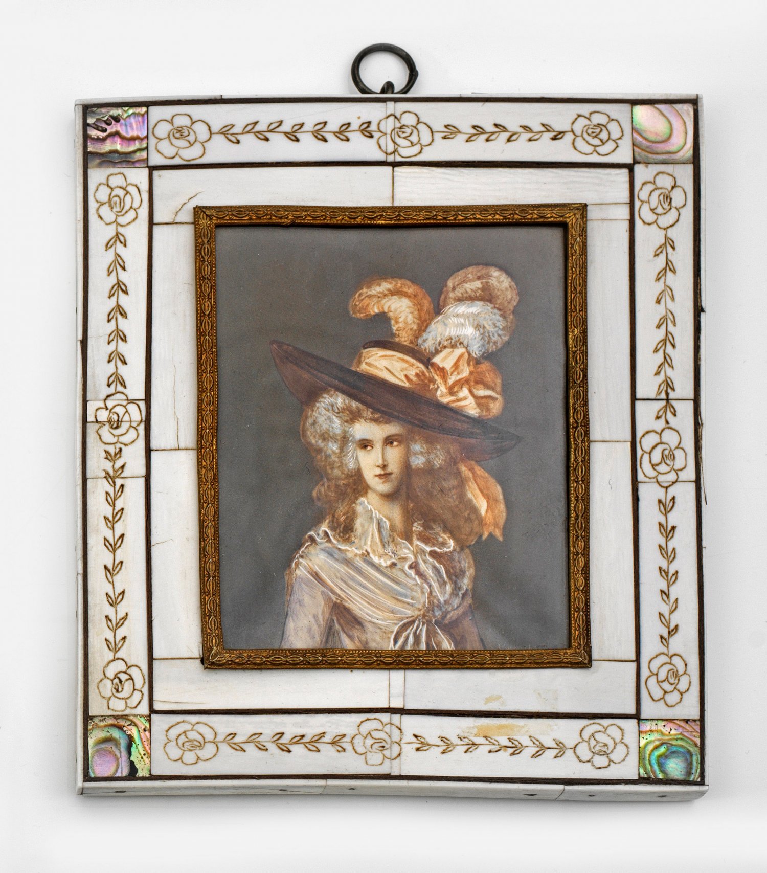 Damenporträt Bildnis der jungen Mrs. Hallet in einem hellen Spitzenkleid. Auf den hochtoupierten Haaren ein prächtiger, burgundfarbener Federhut mit üppiger, apricotfarbener Schleife. R. u. undeutl. sign.; Rückseitig bez.; Tempera auf Elfenbein. Breiter, ornamentierter Elfenbeinrahmen mit Perlmuttereinlagen. Messingblende. 10 cm x 8 cm.