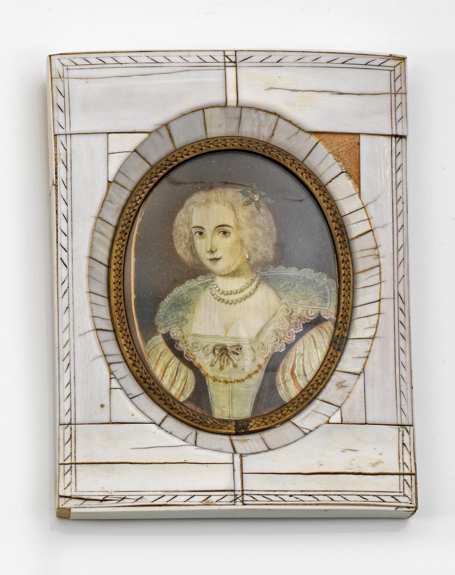 Damenporträt Hüftbildnis einer jungen Dame in weiß-braunem Kleid mit breitem Spitzenkragen, Schleife und Perlschmuck. Im hochgesteckten, weiß gepuderten Haar eine Rosenblüte. Mischtechnik auf Elfenbein. Breiter, mit Elfenbein belegter Rahmen. Messingblende. Rahmen besch.; 9 cm x 7 cm.