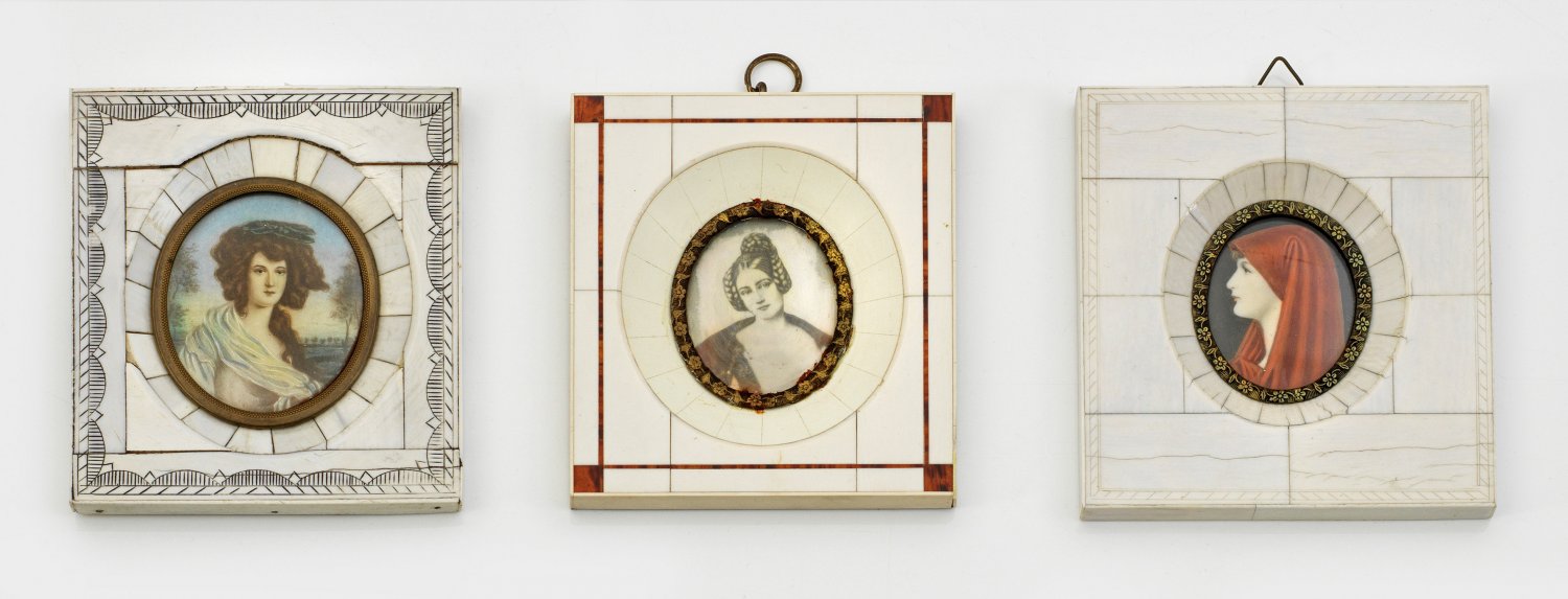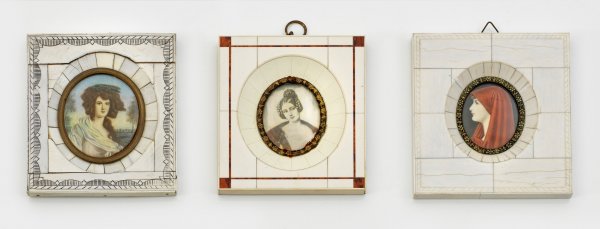 Drei Damenbildnisse Bildnis einer Dame mit hellem Seidentuch über den Schultern vor Landschaftshintergrund, mit kunstvoll geflochtenen Haaren sowie Bildnis einer Frau mit rotem Schleier. Mischtechnik auf Elfenbein. Rahmen belegt mit Elfenbeinelementen. Messingblenden. Teilw. unleserlich sign.; 6,5 cm x 5,5 cm.