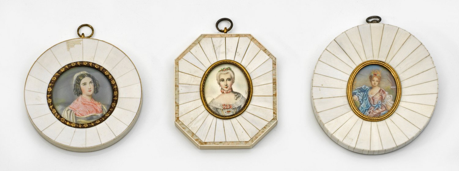 Drei Damenporträts Porträt einer Dame in Tracht mit Spitzenhaube, mit weißem Kleid mit Blüten im Haar sowie ein Hüftbildnis der Madame de la Briffe. Mischtechnik auf Elfenbein. Rahmen belegt mit Elfenbein- bzw. Perlmutterelementen. Messingblenden. Teilw. sign. Dimarc, rückseitig bez. G. Rigand. 5,5 cm x 5,5 cm.