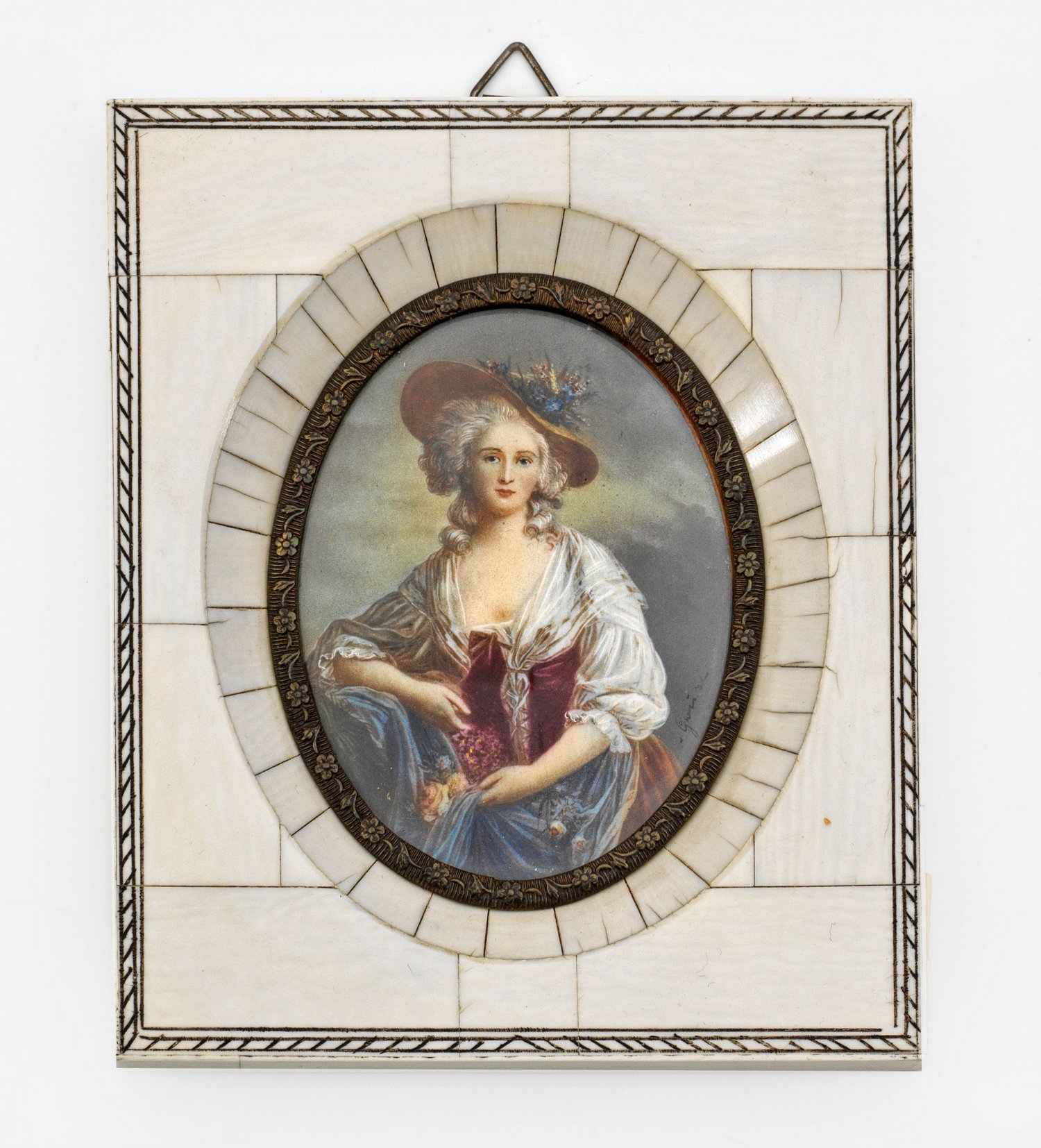 Rokoko-Damenporträt Bildnis einer jungen adeligen Dame im bäuerlichen Gewand und Blumenbukett im Schoß. Auf den gepuderten, hochgesteckten Haaren ein Strohhut mit blauen Kornblumen und Ähren. Tempera auf Elfenbein. R. u. undeutl. bez.; Breiter, mit Elfenbein belegter, schwarz gravierter Rahmen. Messingblende. 8,5 cm x 6,5 cm.