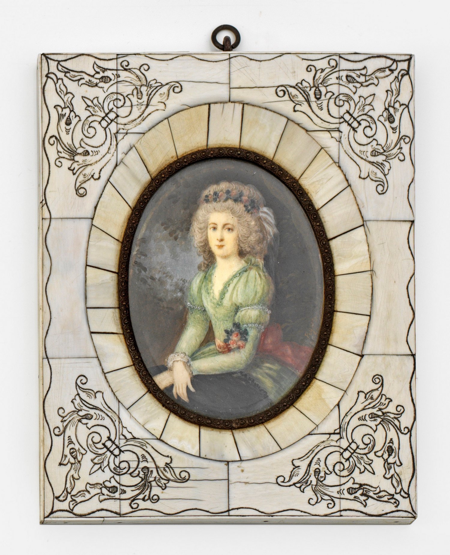 Rokoko-Damenporträt Bildnis einer sitzenden jungen Dame in zart grünem Kleid mit rosafarbener Schleife und kleinem Rosenbukett. Das aufgesteckte, gepuderte Haar geschmückt mit einem Rosenkranz. R.m. sign. Peyne. Tempera auf Elfenbein. Breiter Rahmen mit schwarz graviertem Elfenbein und Messingblende. 9 cm x 7 cm.