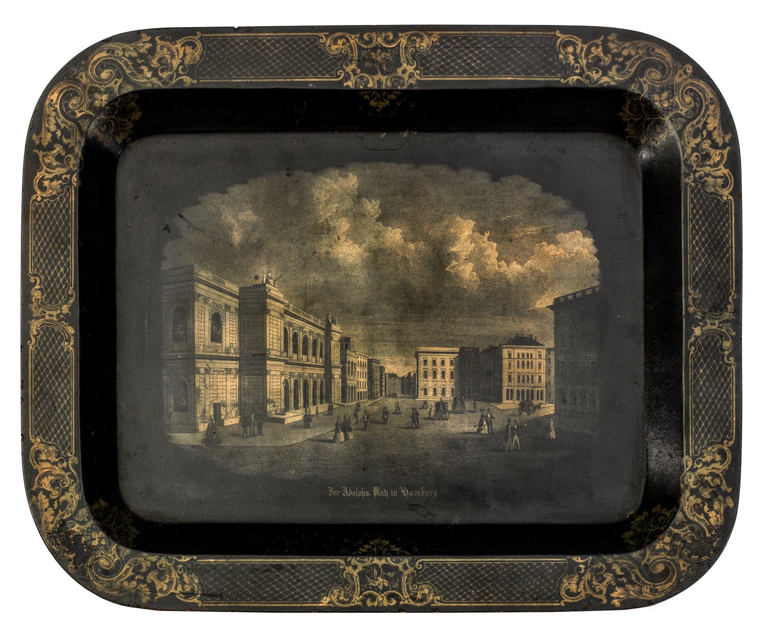 Lacktablett "Der Adolphs-Platz in Hamburg". Originaltitel Pappmaché, schwarz lackiert. Rechteckig mit gerundeten Ecken. Fahne mit Goldornamenten. Im vertieften Spiegel detailreiche Darstellung des Hamburger Adolphs-Platzes. Unterhalb betitelt. Nach einem Motiv von James Gray, aus "Das neue Hamburg. Ansichten". Minim. besch.; 46 cm x 36,5 cm.