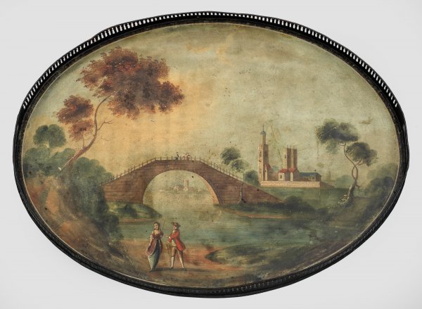 Großes Tablett Weißblech, schwarz lackiert. Oval mit stabförmig durchbrochen gearbeitetem Rand und ausgesparten Griffmulden. Im Spiegel szenische Darstellung eines Paares vor weitläufiger Flusslandschaft mit Steinbogenbrücke und Kirche. Polychrome Lackmalerei. Altersgemäße Gebrauchsspuren. 61,5 cm x 48 cm.