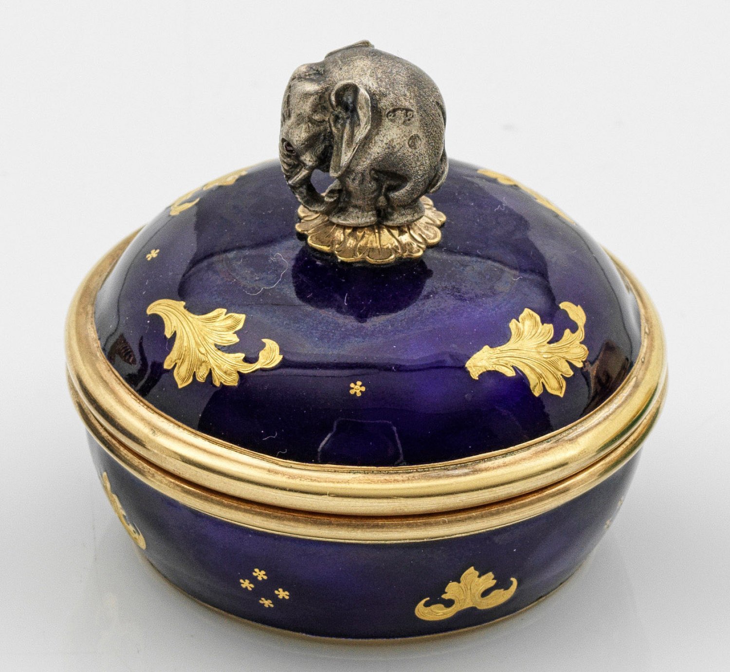Deckeldose im Stil von Karl Fabergé. Silber, teilw. vergoldet und emailliert. Runde Form. Abnehmbarer Deckel. Blau emailliert mit fein ziselierten Goldornamenten in Form von geschwungenen Blättern und kleinen Blüten. Als Knauf ein naturalistisch gearbeiteter, silberner Elefant. Deckelinnenseite mit kleiner Rosette und Farbsteincabochon verziert. Gest. Kokoschnik 88, Meistermarke I.P.; Gew. ca. 100 g. D. 6 cm.