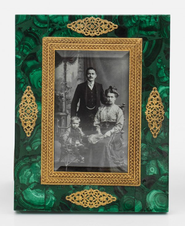 Malachit-Bilderrahmen Malachit und Silber, vergoldet. Holzrahmen mit Malachit belegt. Hochrechteckige Form. Profilierte, geflochtene Blende und vergoldete, ornamentierte Silberapplikationen. Rückwand mit Leder bezogen. Rückseitig aufstellbar. Gest. 88. 20 cm x 15,5 cm. Bildausschnitt 12,5 cm x 7,5 cm.