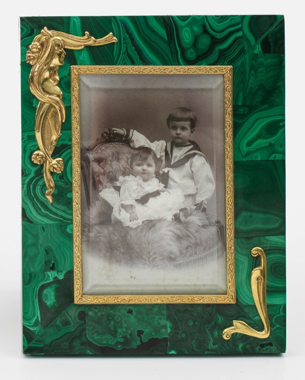 Jugendstil-Bilderrahmen Malachit und Silber, vergoldet. Holzrahmen mit Malachit belegt. Hochrechteckige Form. Profilierte Blende mit zarter Blätterranke. Vergoldete Silberapplikation im Jugendstil. Profildarstellung einer Frau mit langen, in Blütenranken übergehenden Haaren. Rückwand mit Leder bezogen, rückseitig aufstellbar. Gest. 88; 20,5 cm x 16 cm. Bildausschnitt 13,5 cm x 9 cm.