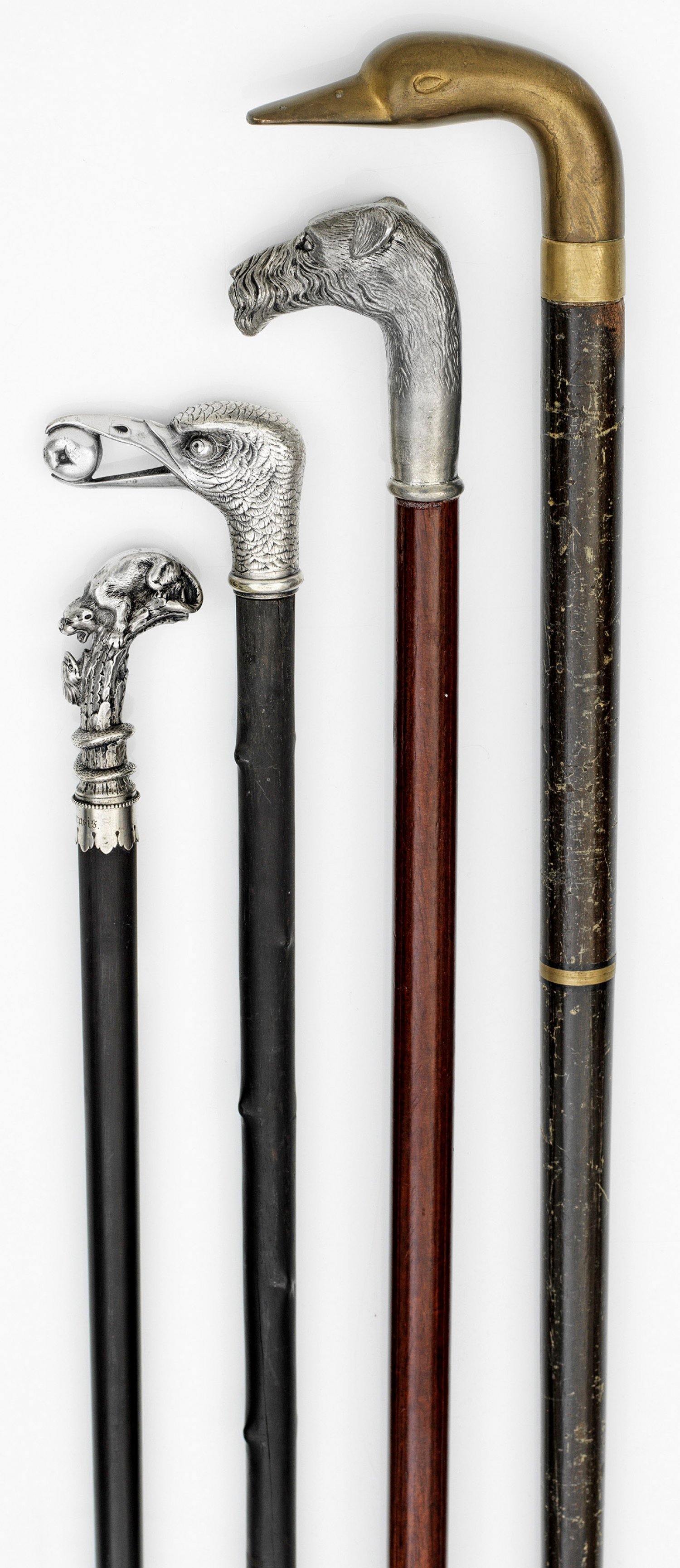 Konvolut Spazierstöcke Holz, teilw. ebonisiert, Zinn, Messing, Silber. Knäufe mit vollplastischem Abschluss in Gestalt eines Terriers, zweier Vögel und einer Raubkatze, mit einer Schlange kämpfend. Altersbedingte Gebrauchsspuren. L. 86 cm - 97 cm.