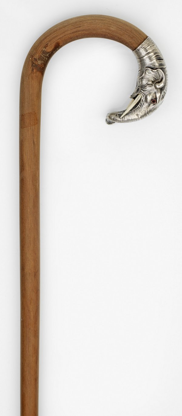 Spazierstock Silber und Elfenbein auf hellem Holzschaft. Plastisch gearbeiteter, gebogter Griff in Gestalt eines Elefantenkopfes mit roten Glasaugen und Stoßzähnen aus Elfenbein. Gest. 800. L. 91 cm.