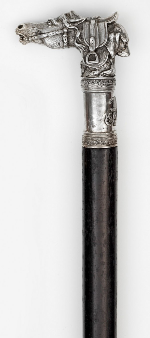 Spazierstock in der Art von Karl Fabergé. Silber, Bein und ebonisiertes Holz. Plastisch als Pferde- und Hundekopf gebildeter Griff, auf der Vorderseite das Monogramm von Zar Nikolaus II. Gest. 84. L. 91,5 cm.