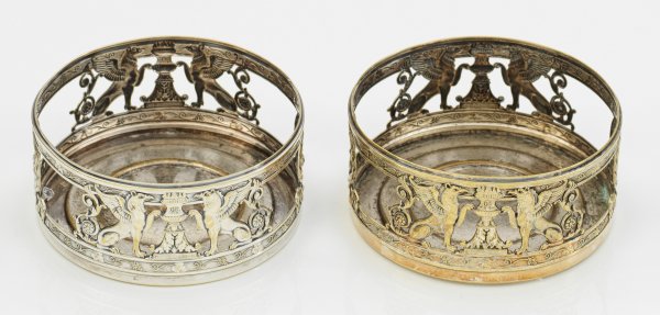 Paar Flaschenuntersetzer Versilbert. Durchbrochene Wandung mit antikisierendem Reliefzierrat aus Griffonen, Vasen und Lorbeerkränzen. Minim. besch./ber. Gest. Herstellerzeichen. H. 5 cm. D. 10,5 cm.