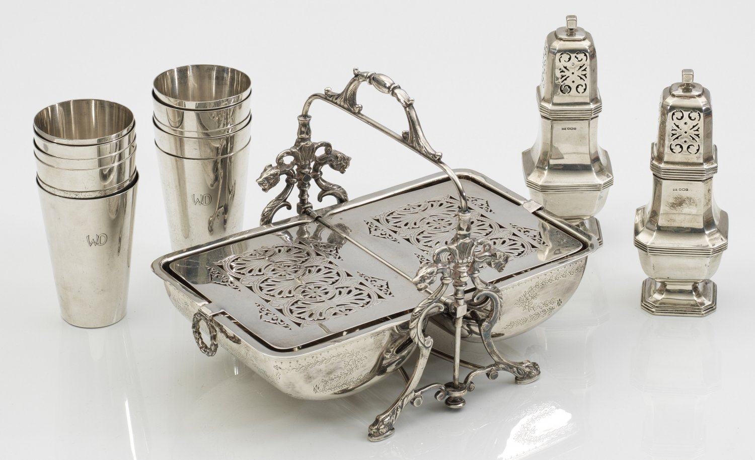 Viktorianische Gebäckbox, Paar Silberstreuer, Becher 14-tlg.; Silber, versilbertes Metall. Paar große Sterling-Zuckerstreuer (Sheffield 1934/1935, ca. 490 g.), große, reich dekorierte englische viktorianische Biskuit-Präsentierbox mit Klappmechanismus, 11 glatte, konische Trinkbecher (WMF). Gest. teilw. Garantiestempel, Herstellerzeichen. H. 12 cm - 22 cm.