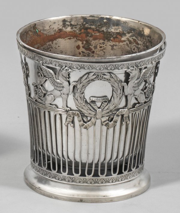 Kleiner Eiswürfelbehälter Silber. Runder, nach oben geweiteter Einsatzbehälter, dekoriert mit Griffonen, Lorbeerkränzen und Plametten in Durchbrucharbeit. Gest. 800, Herstellerzeichen. Metalleinsatz wohl sekundär. Gew. ca. 220 g. (ohne Einsatz). H. 12 cm.