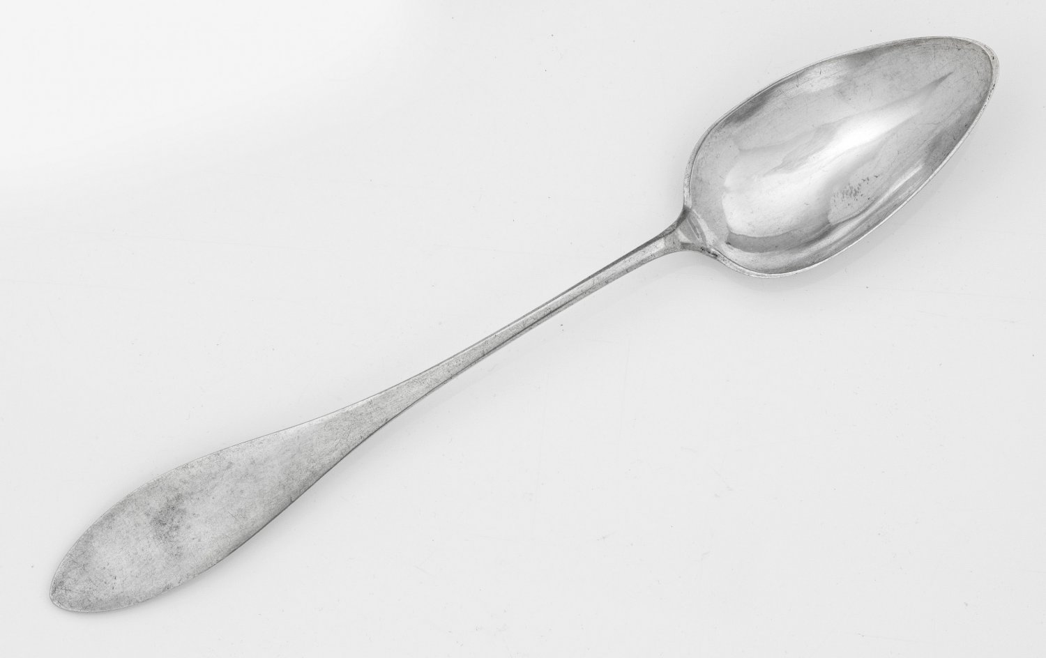 Vorlegelöffel Silber. Spitzovale Laffe, übergehend in flachen Griff mit lanzettförmigem Stiel. Gest. 13, Herstellerzeichen. Gew. ca. 78 g. L. 29,5 cm.