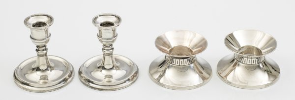 Zwei Paar kleine Kerzenleuchter 4-tlg.; Silber. Paar Leuchter im Stil des 18. Jh. (Birmingham 1981), sowie Paar moderne Leuchter (Wilkens, gest. 800). Gest. Garantiestempel, Herstellerzeichen. Gefüllt. H. 6 cm - 11 cm.