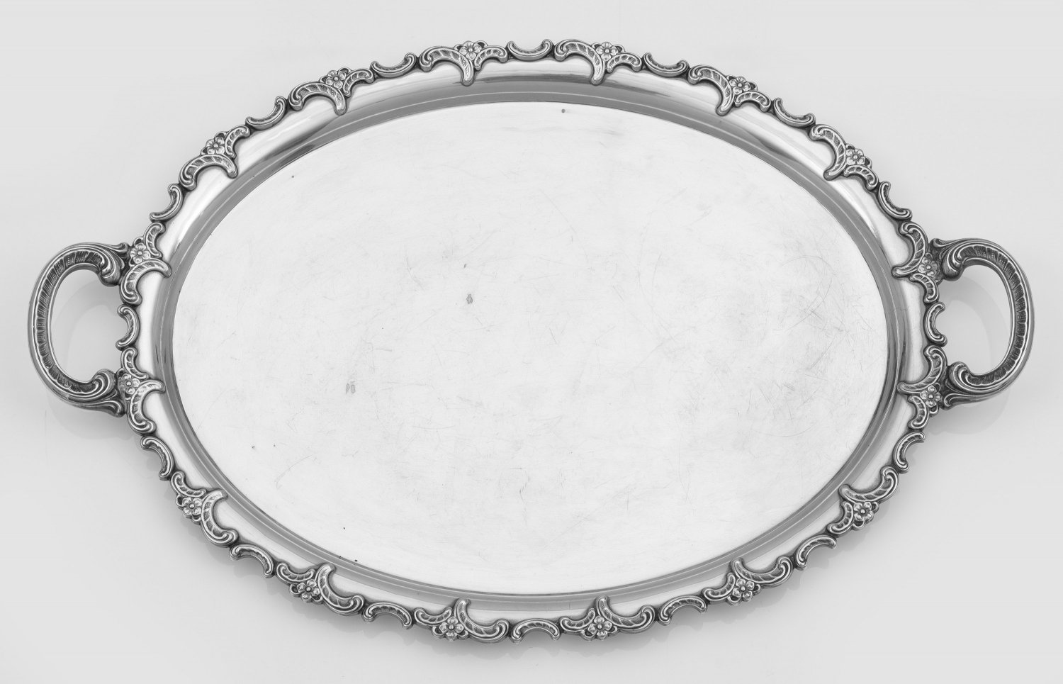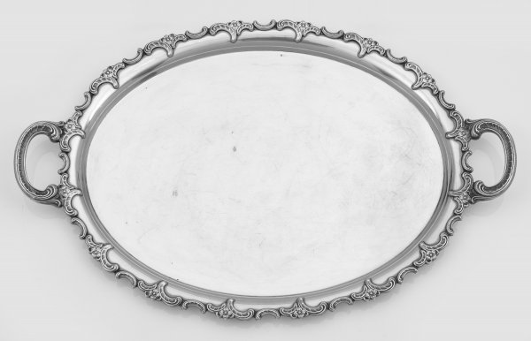 Serviertablett "Alt-Heidelberg" Silber. Ovale Form mit Akanthus-Handhaben, Rand mit plastischem Muster aus C-Schwüngen und Blüten verziert. Auf der Unterseite eine Widmungsinschrift aus dem Jahr 1965. Gest. 925, Herstellerzeichen, Musterangabe. Gew. ca. 1190 g. 36 cm x 55,5 cm.