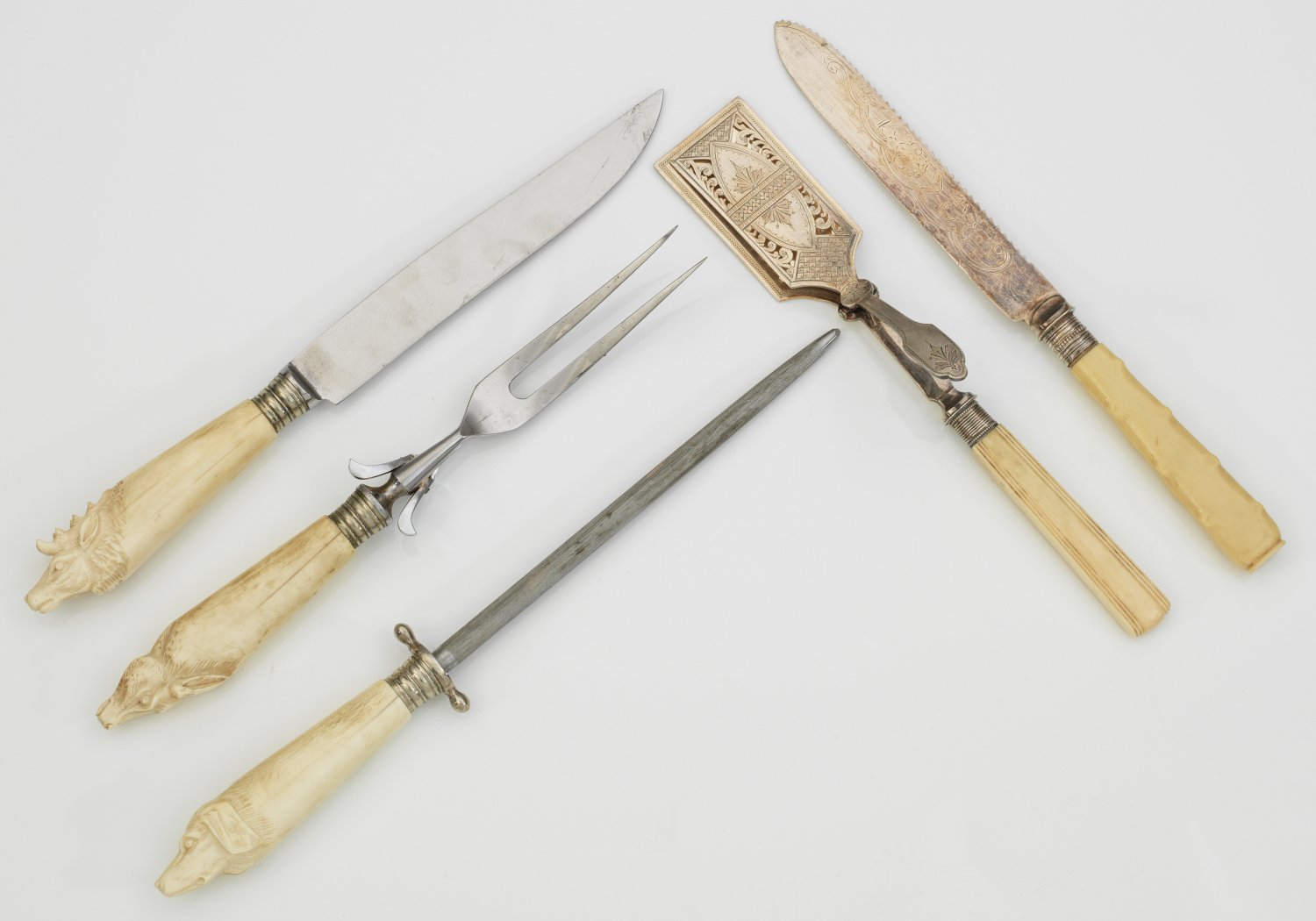 Konvolut Tranchierbesteck 5-tlg.; Knochen, Bein, versilbertes Metall. Spieß, Gabel und Messer mit geschnitzten Tierkopf-Griffen, gravierter Zangenheber sowie graviertes Knochensägemesser. L. 27 cm - 34 cm.