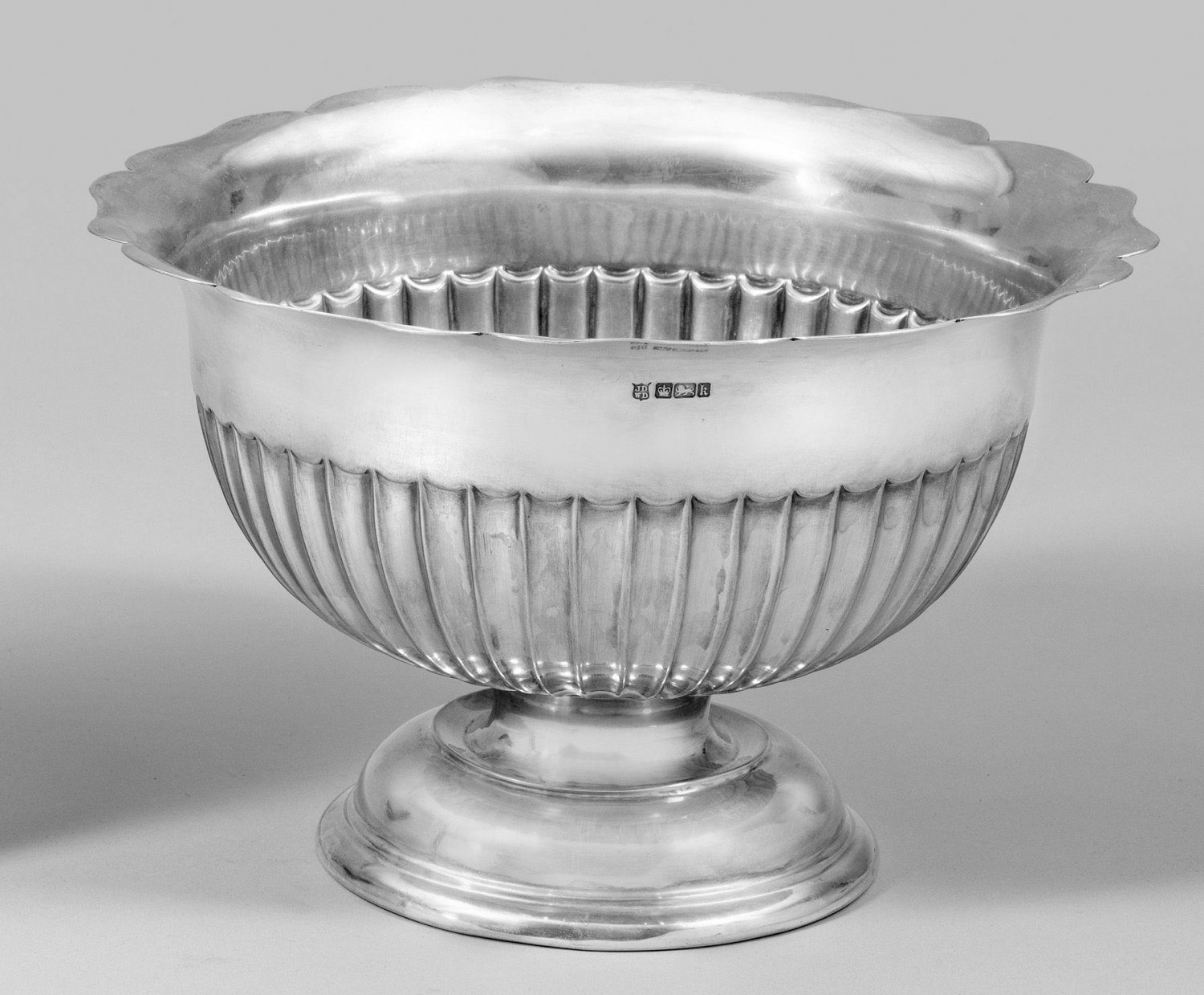 Große Schale im klassizistischen Stil Silber. Über profiliertem, eingezogenem Fuß in Form von Kanneluren godronierte Wandung, der Rand passig geschweift. Gest. Beschau- und Herstellerzeichen, Ältermannbuchstabe. Gew. ca. 880 g.; H. 17 cm. D. 26 cm.
