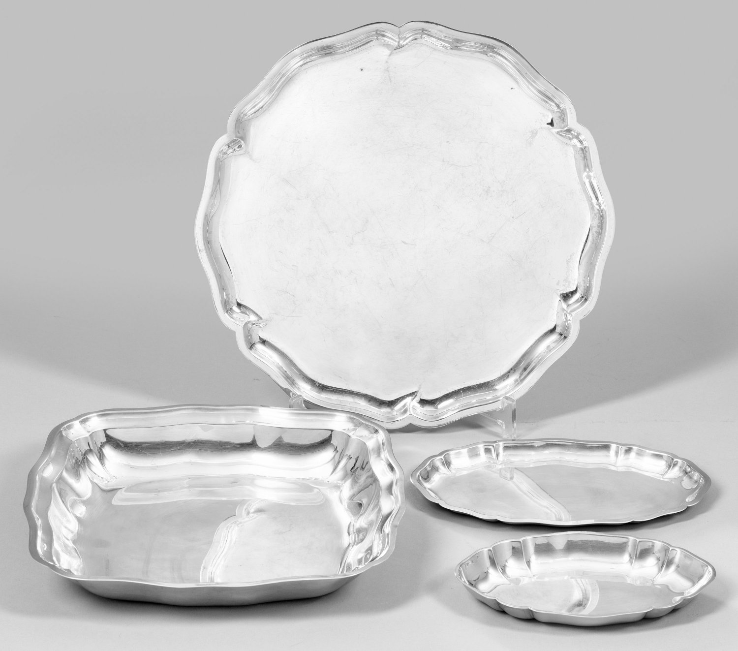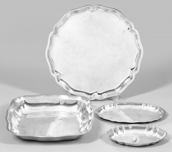 Konvolut Schalen und Tabletts 4-tlg.; Silber. Große quadratische Schale mit geschweiftem Rand (Italien, gest. 800), rundes Tablett in Passform (Wilkens, gest. 835), kleine Schale (Wilkens, gest. 835), kleines Tablett (Gebr. Deyhle, gest. 925). Gest. Garantiestempel, Herstellerzeichen. Gew. zus. ca. 1120 g.; 16,5 cm - 29 cm.