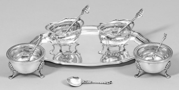 Gewürzmenage 10-tlg.; Silber und versilbert. 2 spätviktorianische ovale Schälchen, 2 runde Schälchen, 5 Löffelchen, Tablett. Gest. Sterling, Silbermarken. Gew. zus. 247 g. (nur massive Teile). B. 22,5 cm.